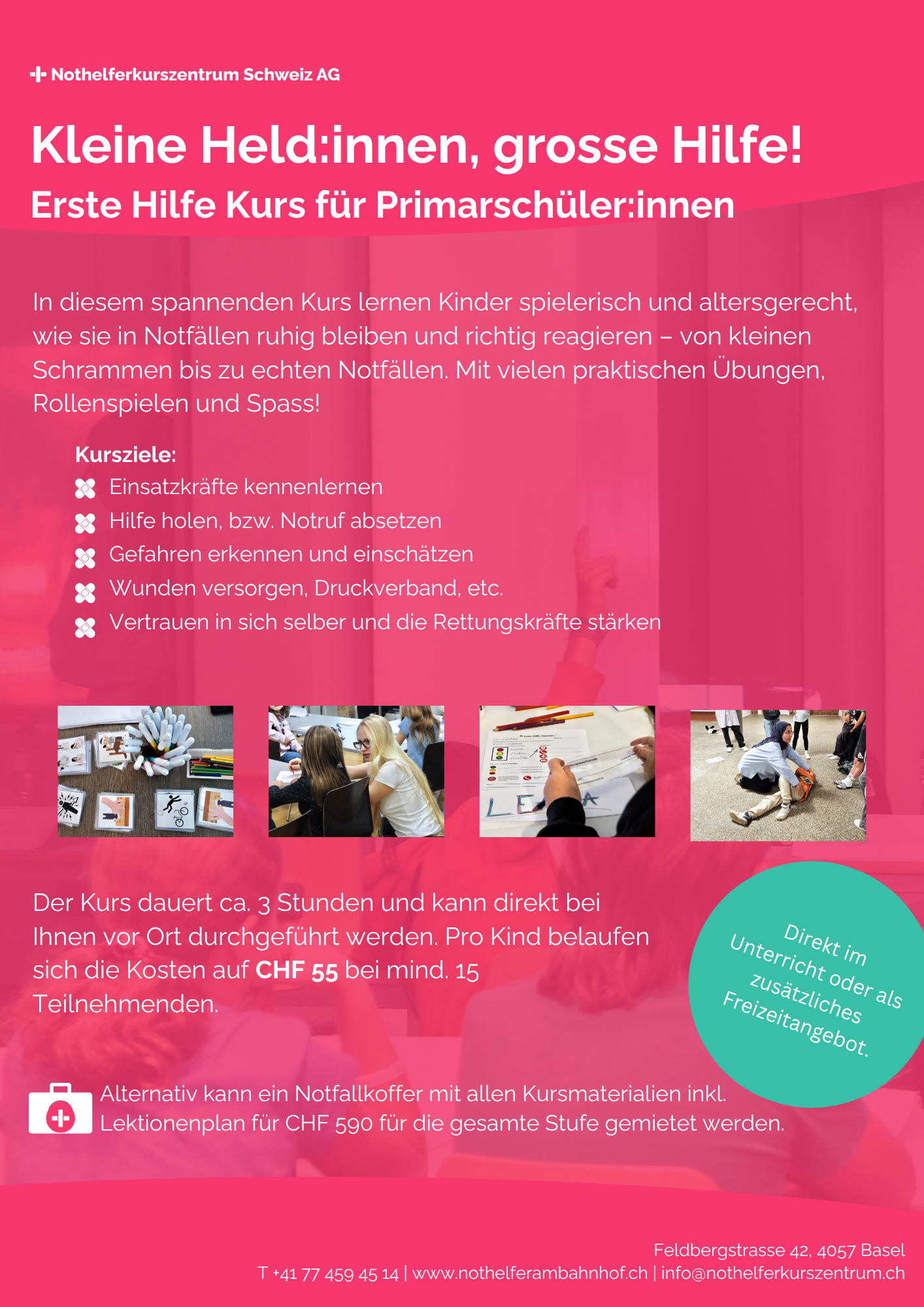 Der Kurs dauert ca. 3 Stunden und kann direkt bei Ihnen vor Ort durchgeführt werden. Pro Kind belaufen sich die Kosten auf CHF 55 bei mind. 15 Teilnehmenden.